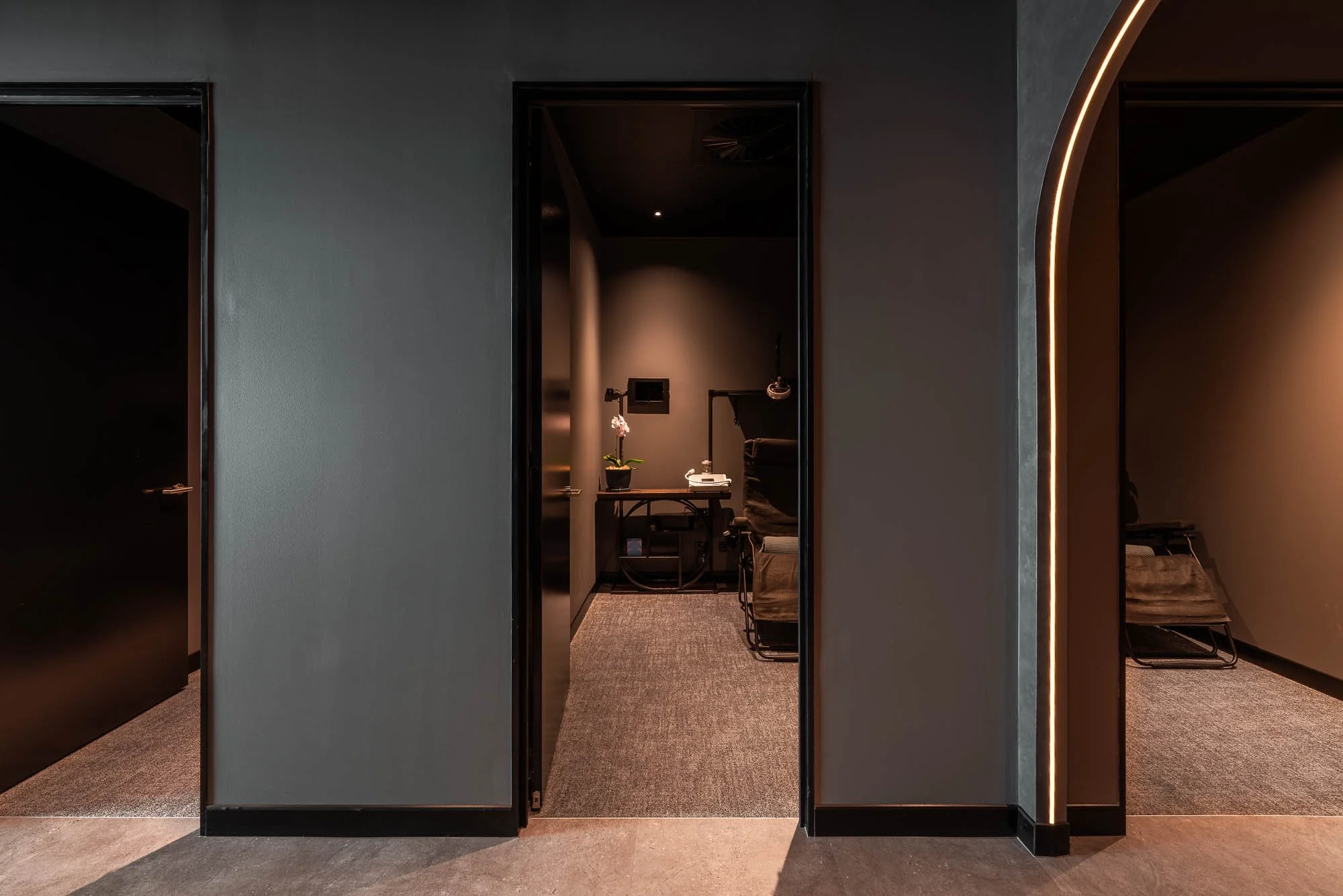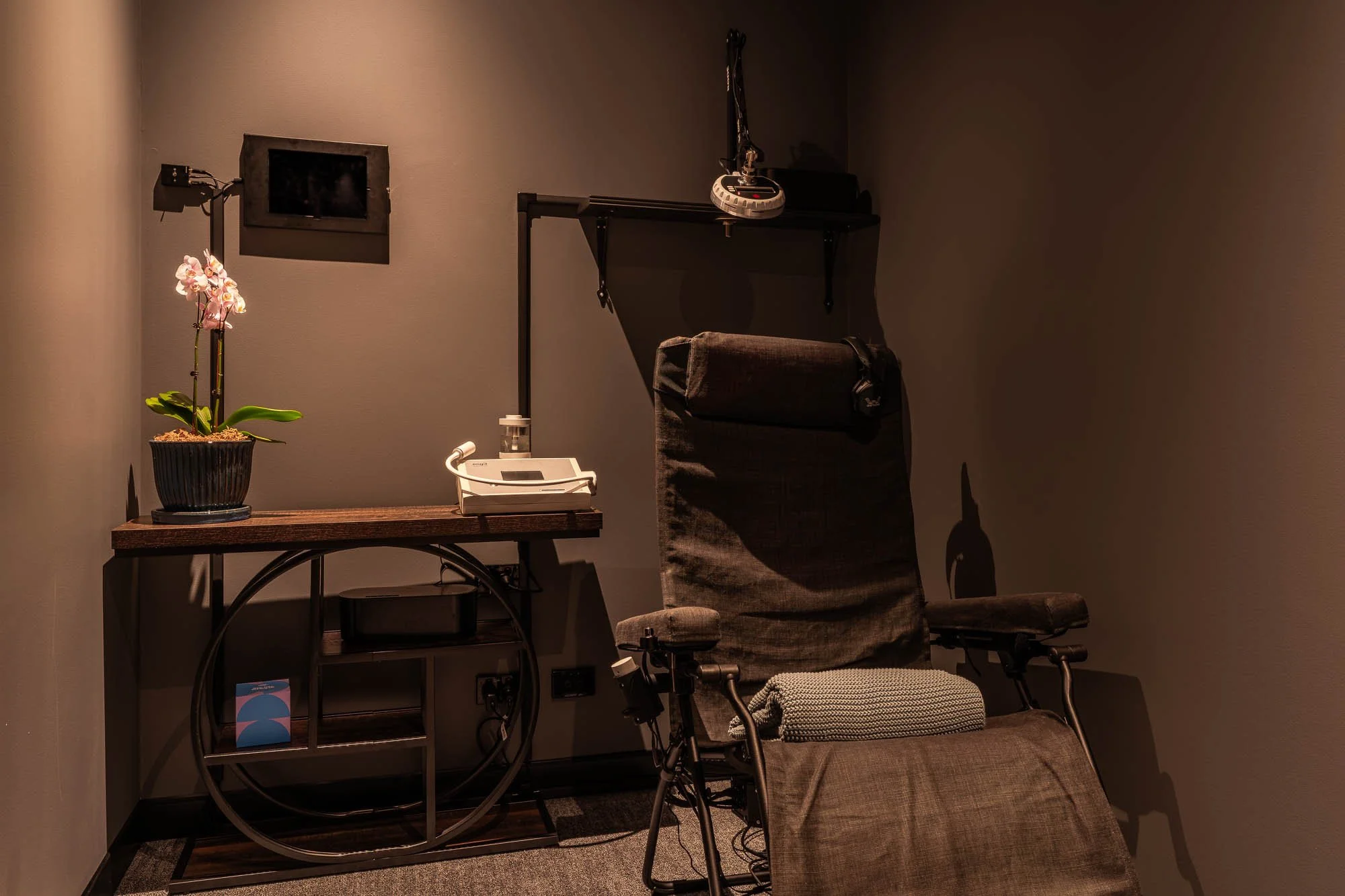 You walk in. We have a quick chat about what's going on — stress, sleep, energy, mood — and recommend a session: 18 or 30 minutes, one device, two, or all three firing at once. Private room. Clothes stay on. You get comfortable in the chair.
