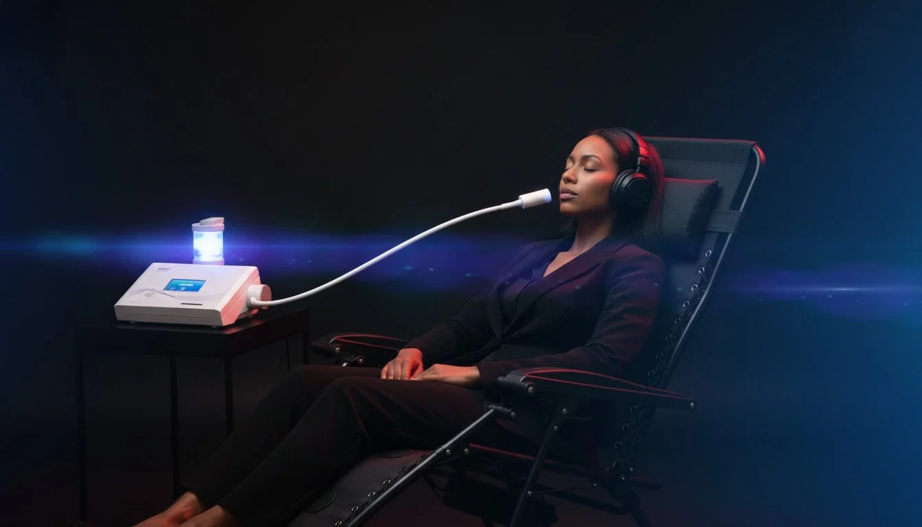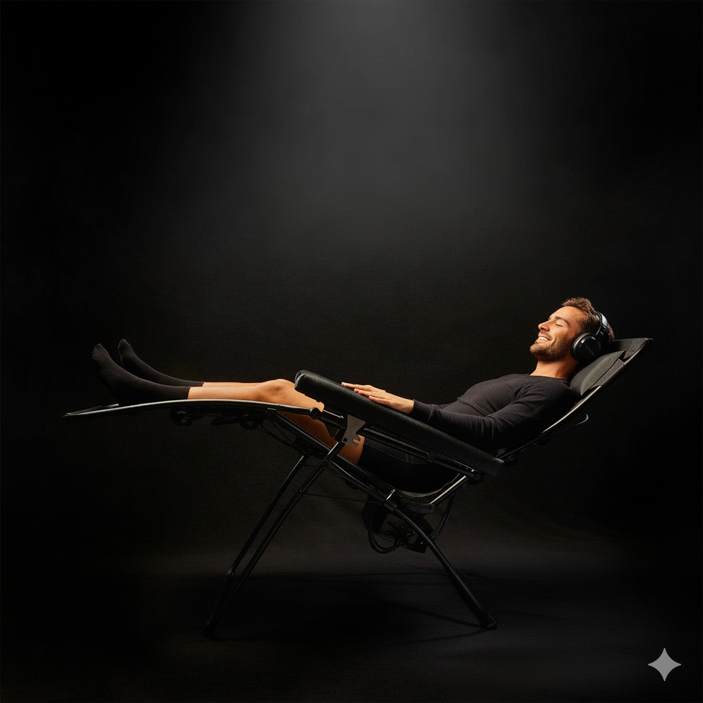 A specialised chair that uses full-body vibration, sound, and guided breathing to release tension, restore energy, or sharpen physical readiness — depending on what you need.